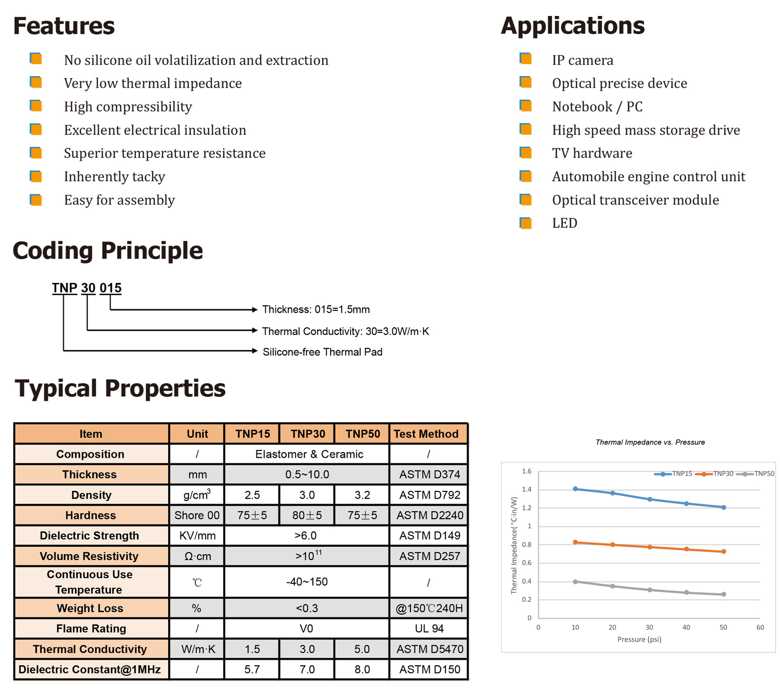 TM TNP系列是具有超高導(dǎo)熱性的無(wú)硅導(dǎo)熱墊,為填充硅油敏感電子元件和散熱器之間的氣隙提供了熱解決方案。它具有高壓縮性、粘性表面、柔軟性和靈活性。此款導(dǎo)熱墊可以防止硅油對(duì)電子元件的污染。" />