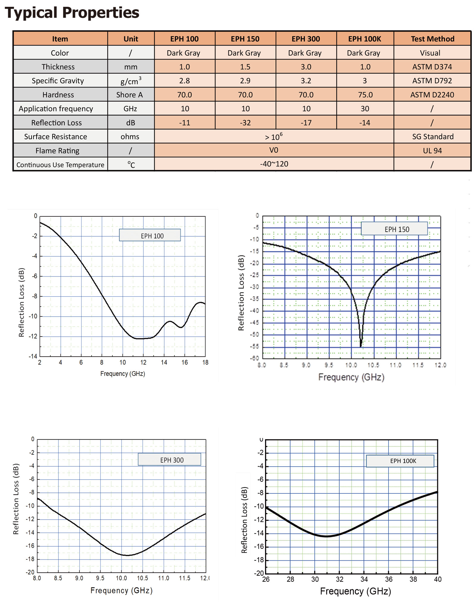 TM EPH系列是一種由高磁導(dǎo)率合金粉末和橡膠混合、分散、壓制而成的高頻吸收材料。該材料可以通過絕緣損耗、磁損耗和阻抗損耗將電子設(shè)備發(fā)射的電磁波轉(zhuǎn)化為熱能來減少電磁輻射。" />