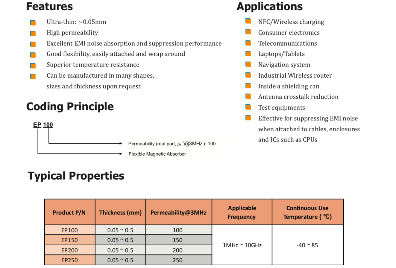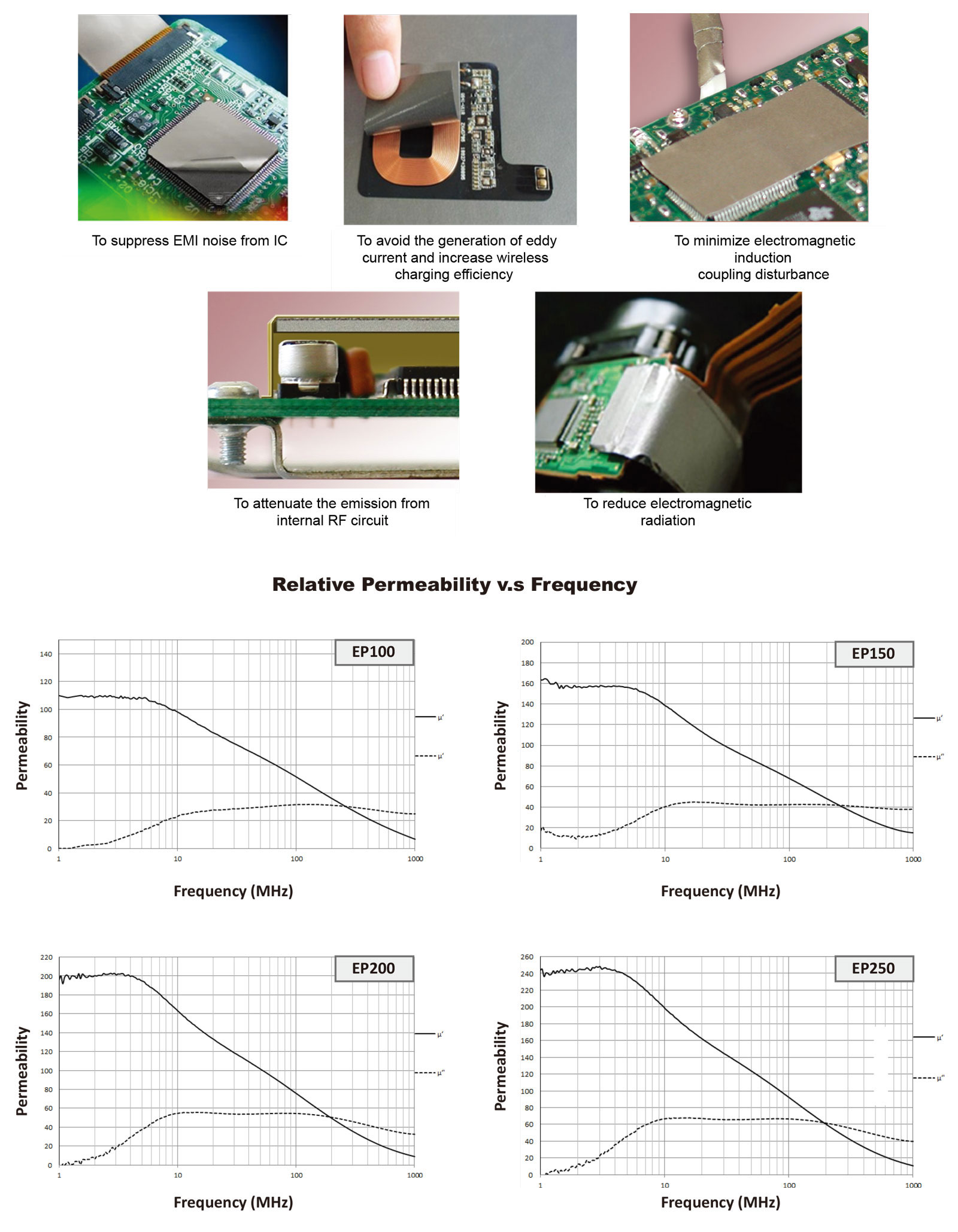 TM EP系列柔性磁吸收材料設(shè)計(jì)用于抑制電子設(shè)備產(chǎn)生的有害電磁波和高頻噪聲。本產(chǎn)品還可用于保護(hù)產(chǎn)品免受外部噪音的影響,從而減少由相鄰電子產(chǎn)品的電磁波引起的故障和干擾。" />