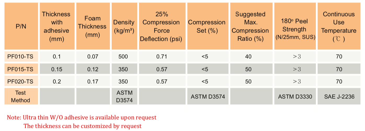 TM PF-TS系列是一種超薄、高性能的泡棉,用于電子設(shè)備的緩沖、保護性密封和長期間隙填充。PF-TS系列具有極低的壓縮永久變形、高密封性能和優(yōu)異的沖擊吸收性能。標準顏色為黑色,可根據(jù)要求提供其他顏色。PF-TS系列涂有壓花微通道粘合劑,以便在應(yīng)用過程中從粘合劑和基材之間排出空氣。" />