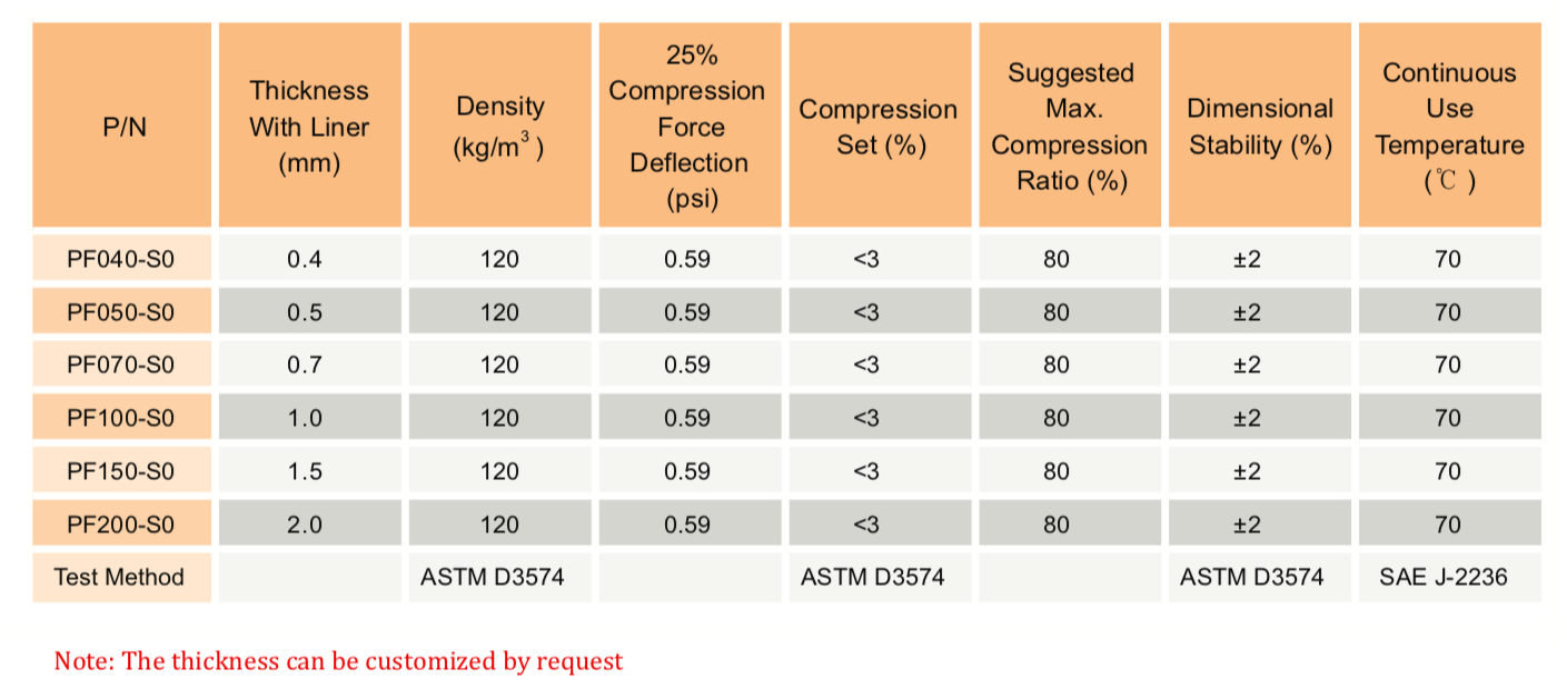 TM PF-S0 系列是一種超柔軟、低密度、緩慢回彈的泡棉,用于電子設(shè)備中的緩沖、保護(hù)性密封和長(zhǎng)期間隙填充??梢赃_(dá)到80%的壓縮比。S0系列泡棉具有非常低的壓縮永久變形率,還擁有高密封性能,以及在不平整表面上也有出色的沖擊吸收能力。" />